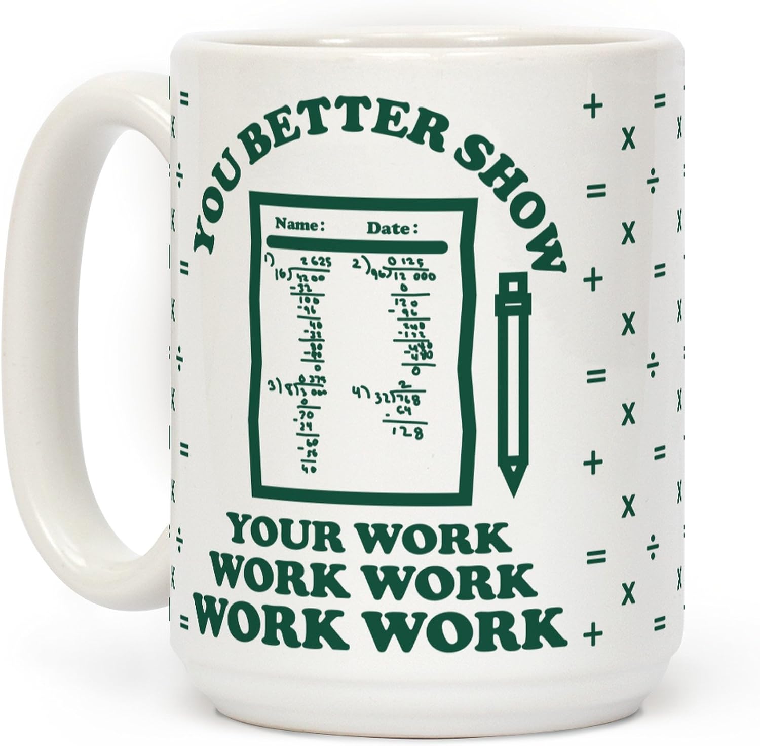 When you all gon' learn, learn, learn, learn, learn! Show your love for teaching and hip hop with this funny math teacher parody coffee mug. This mug features an illustration of a math test along with the phrase "You Better Show Your Work Work Work Work Work."